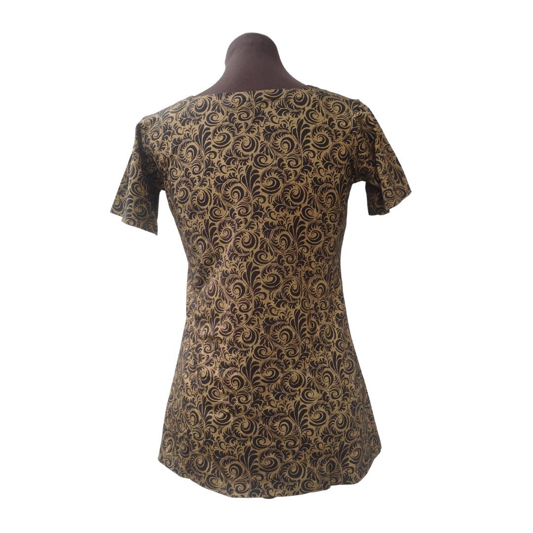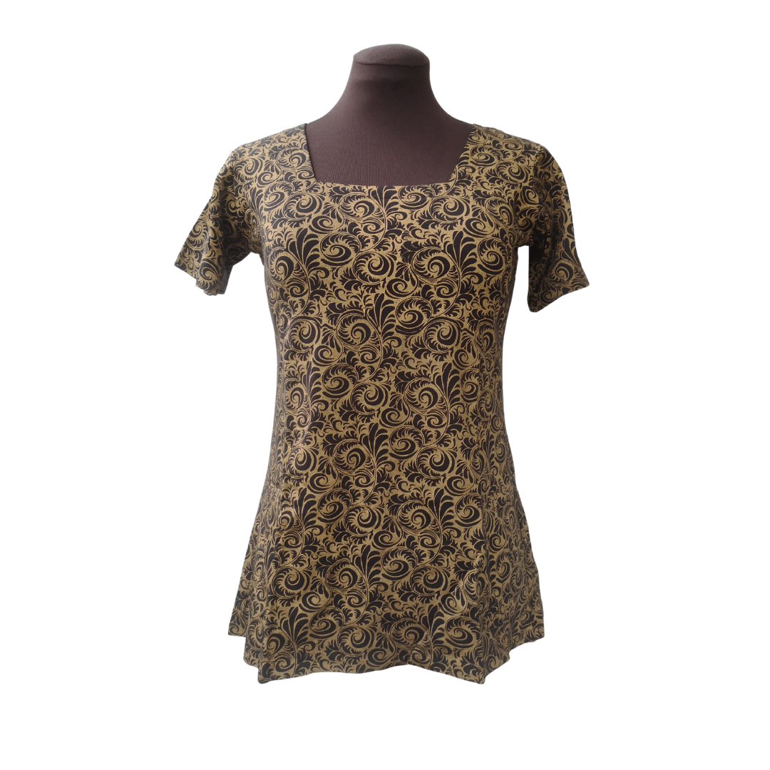 Näyttävä kulla hohtoinen printti ja kulmikas leikkaus pääntiessä.