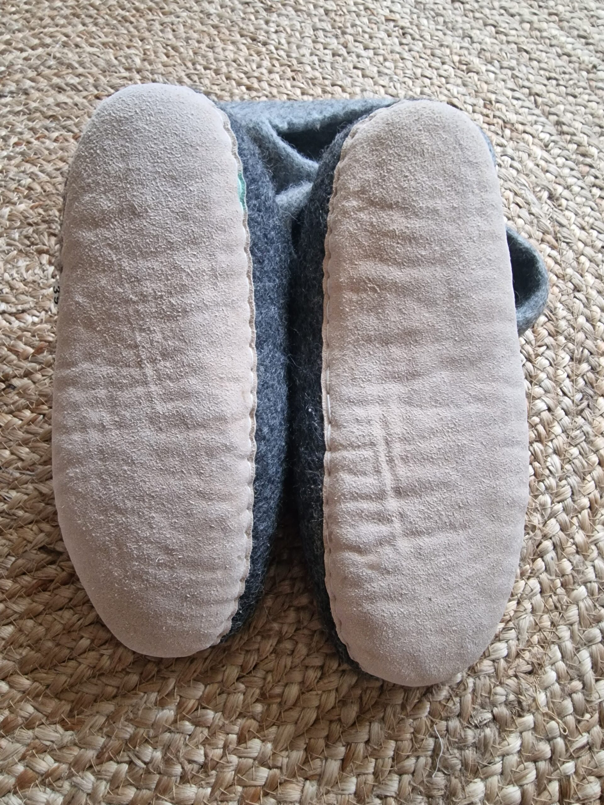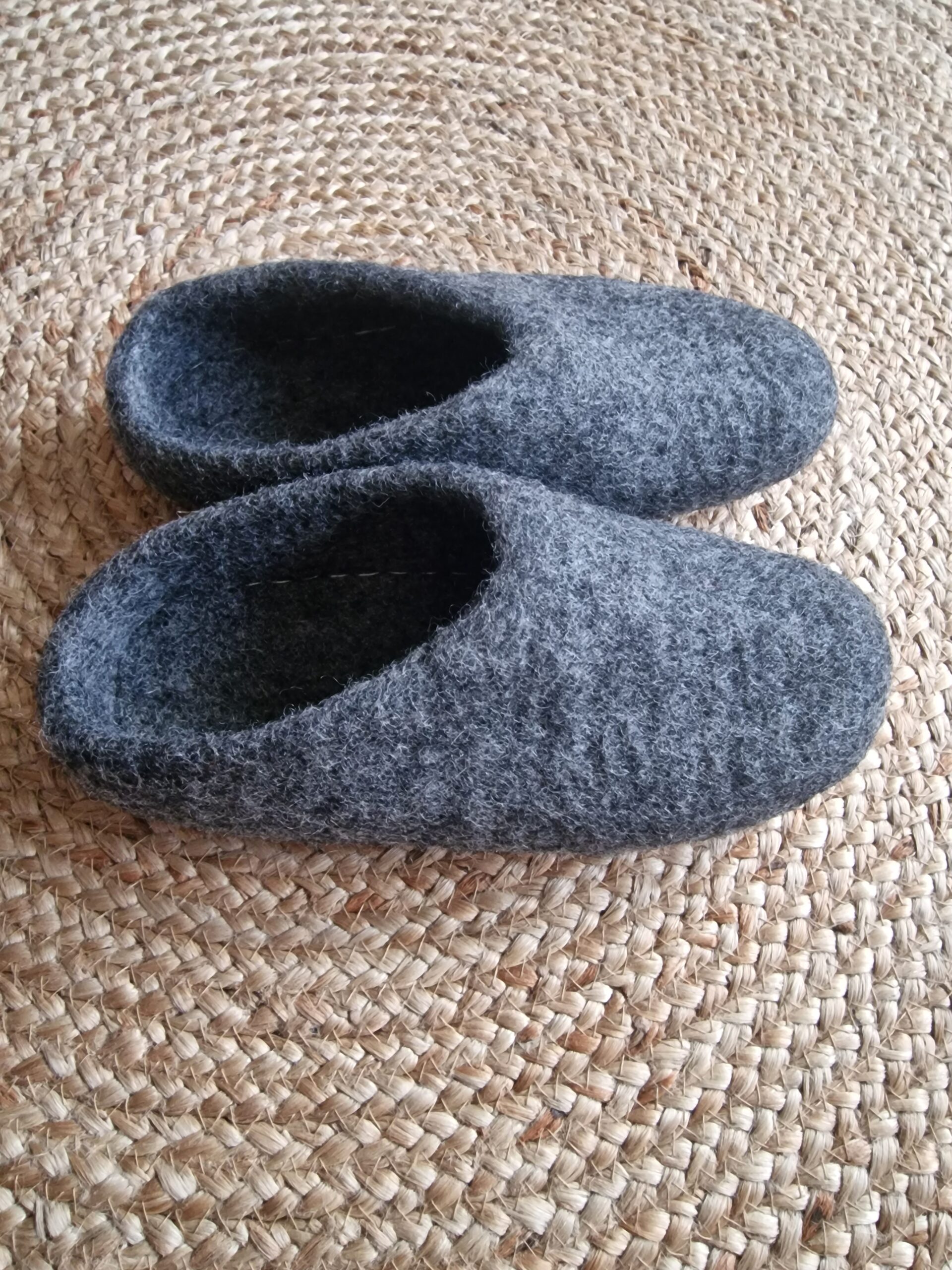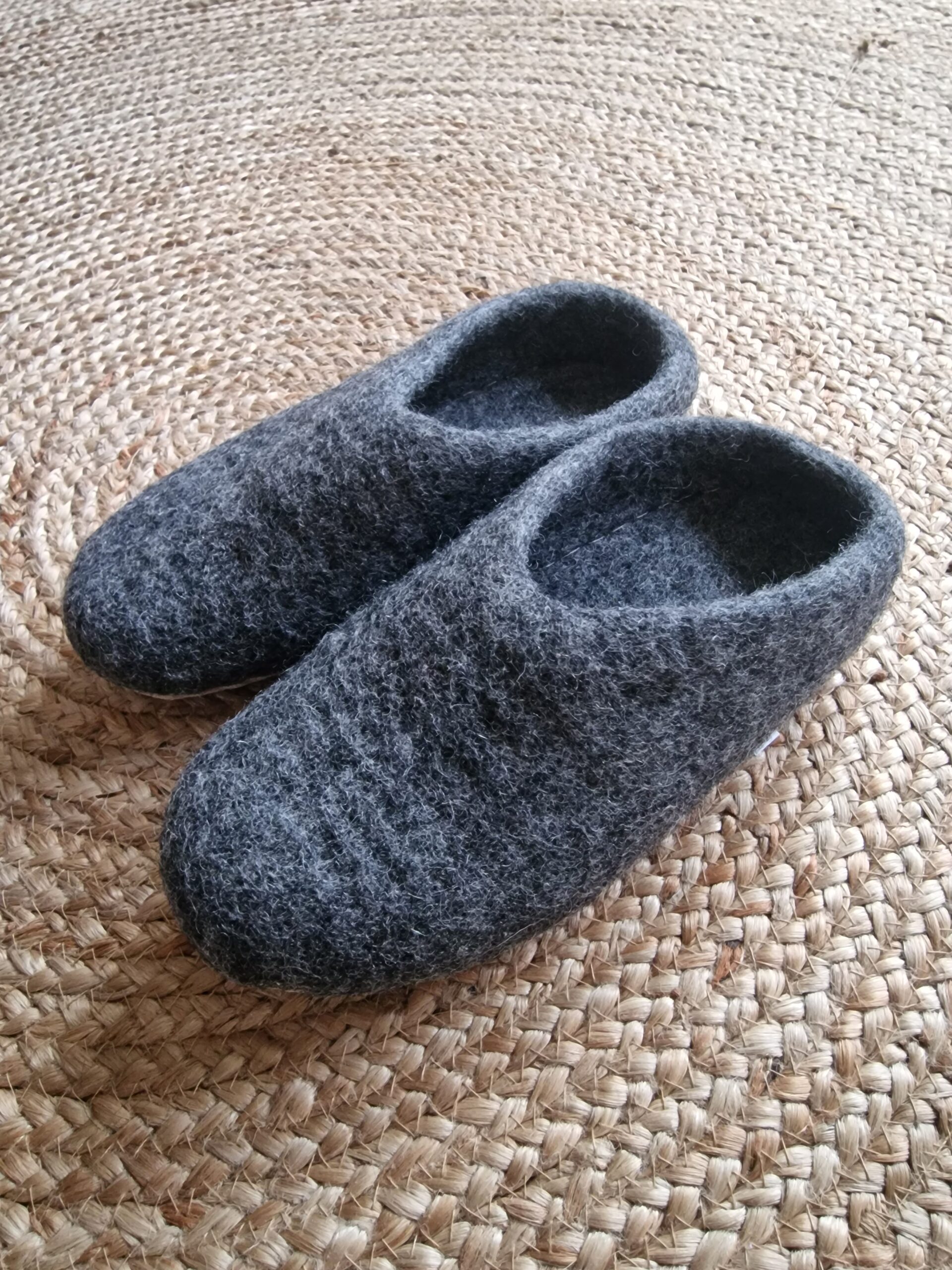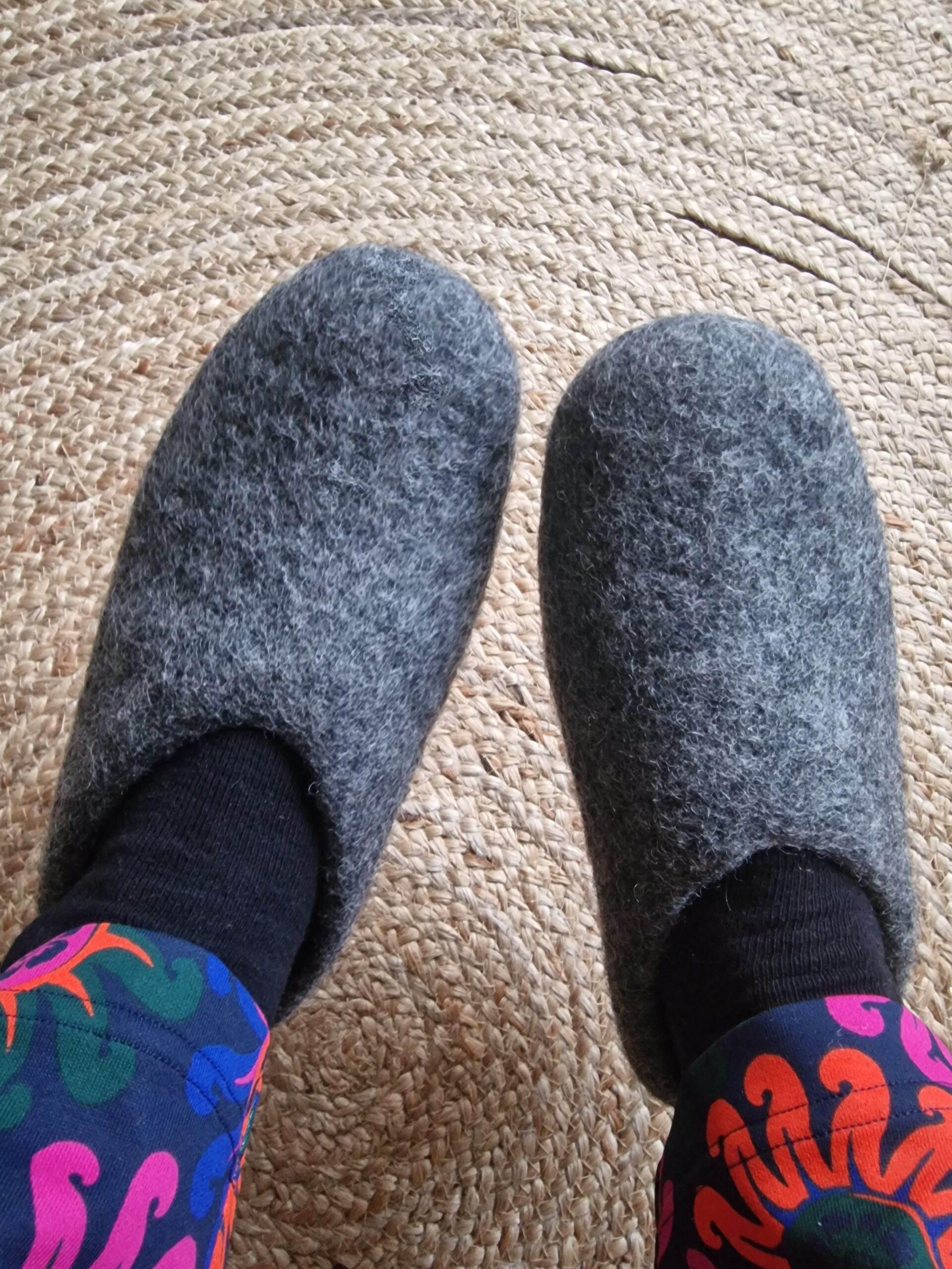 Huovutetut tohvelit jalassa ei varpaita palele. Aikuisten koot 36-46.