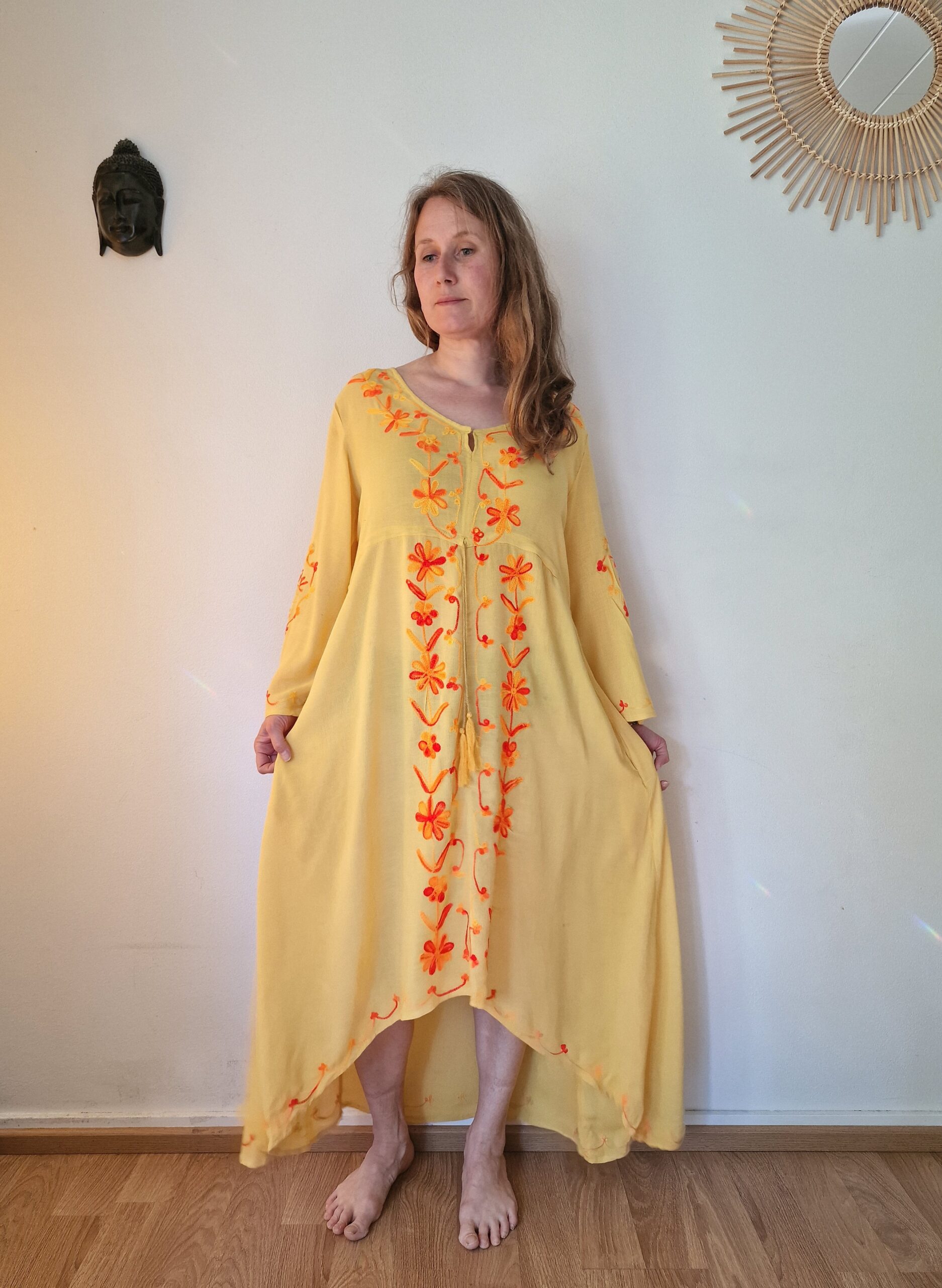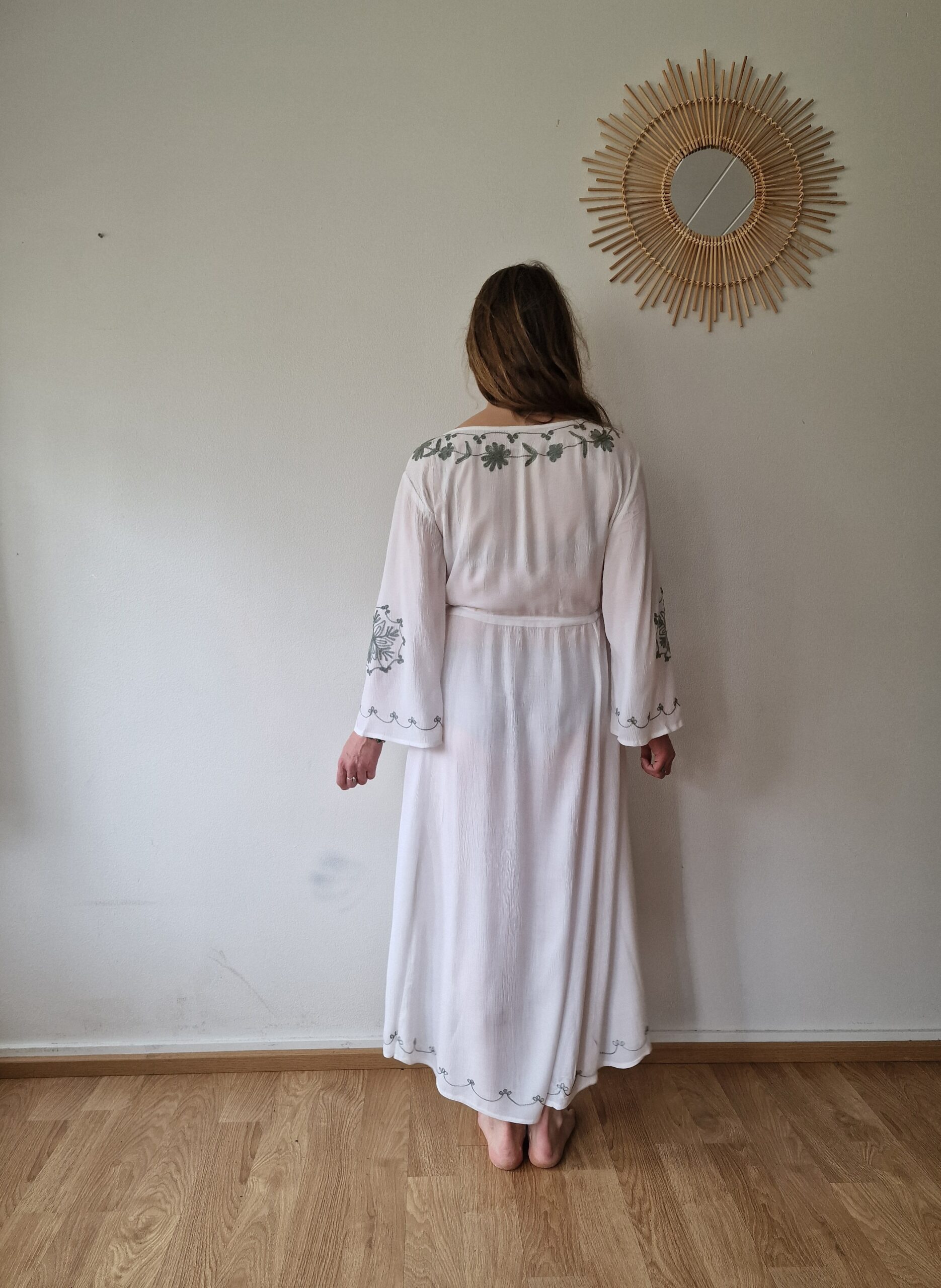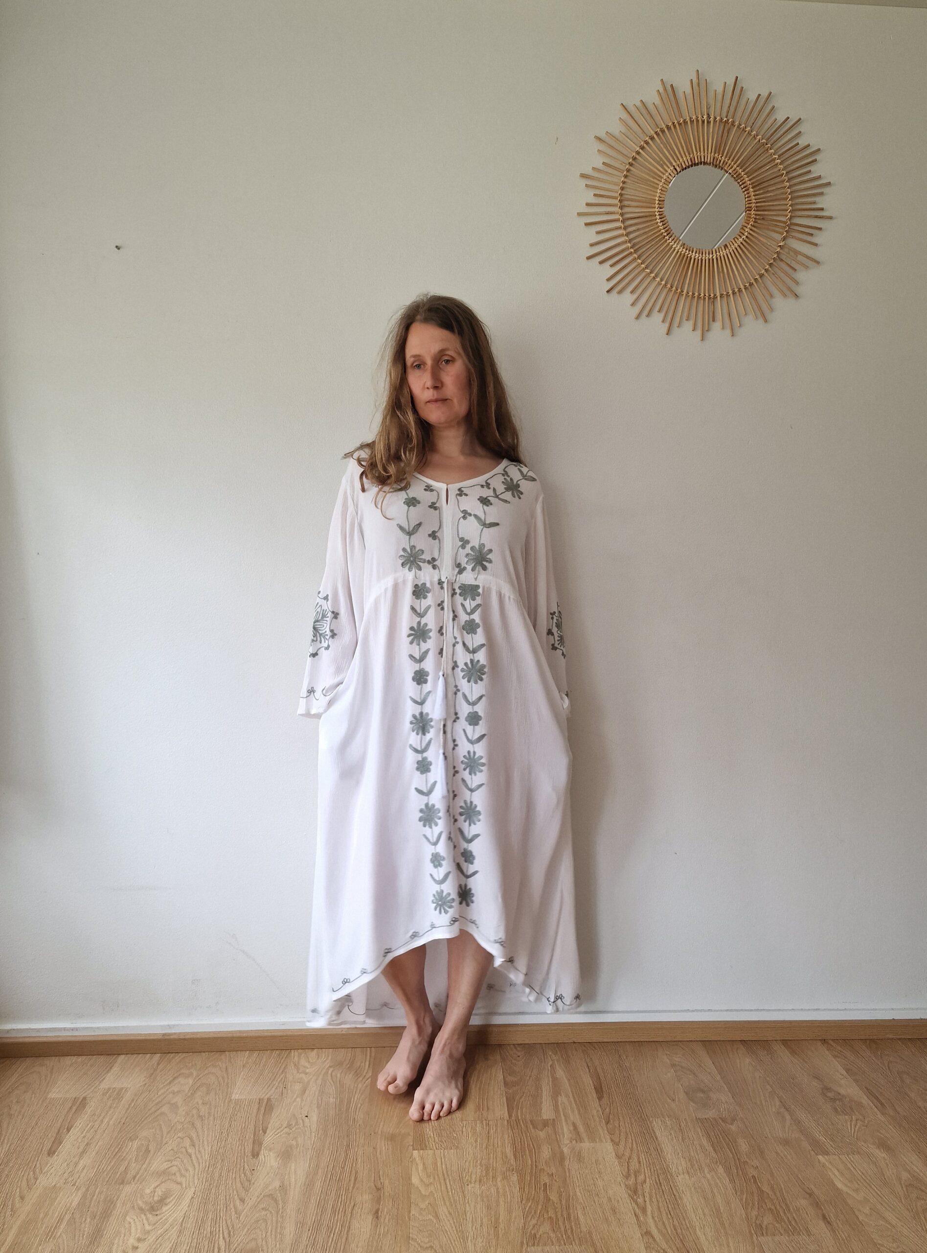 Kukkabrodeerauksilla koristeltu kaftaani.
