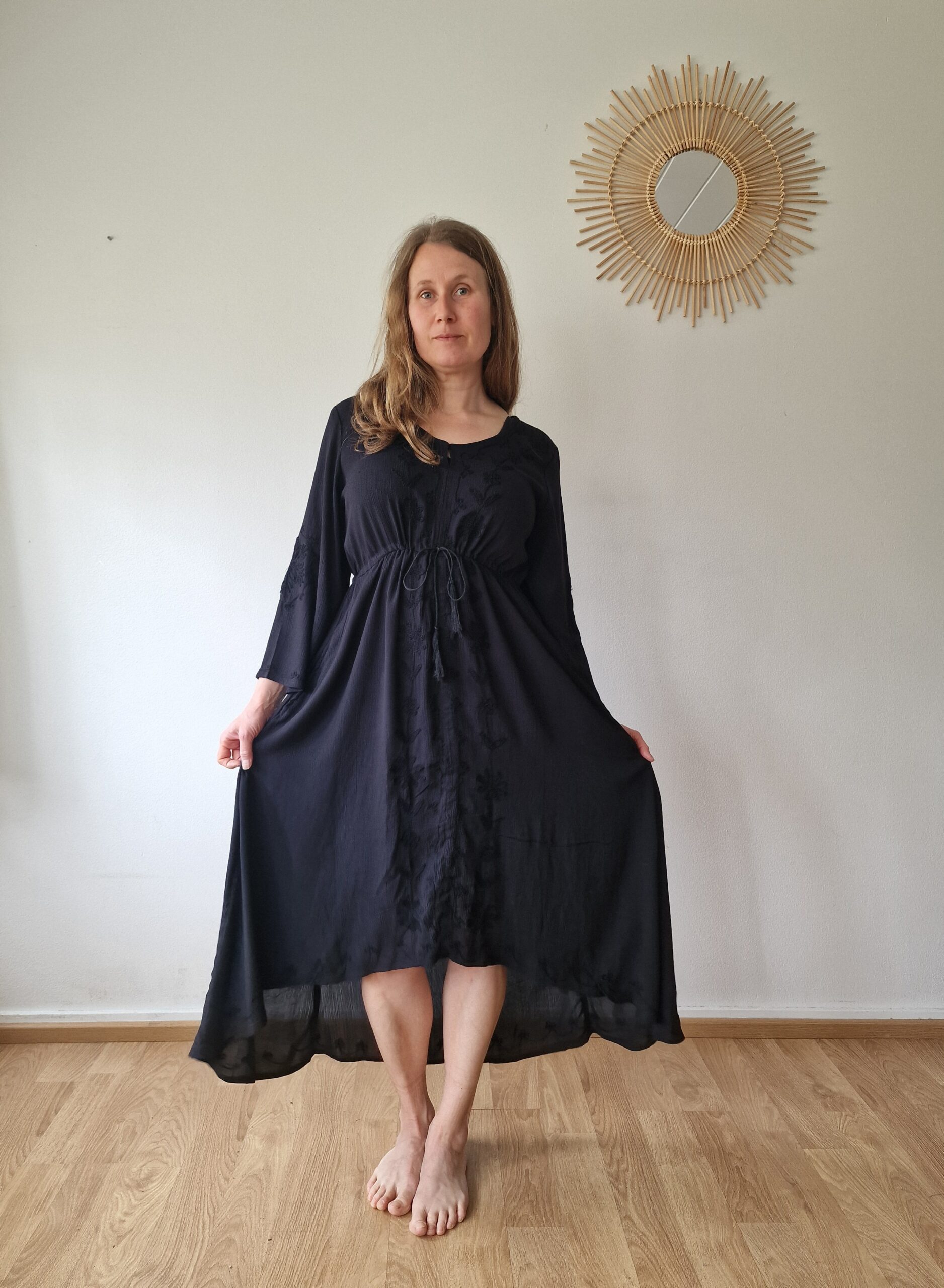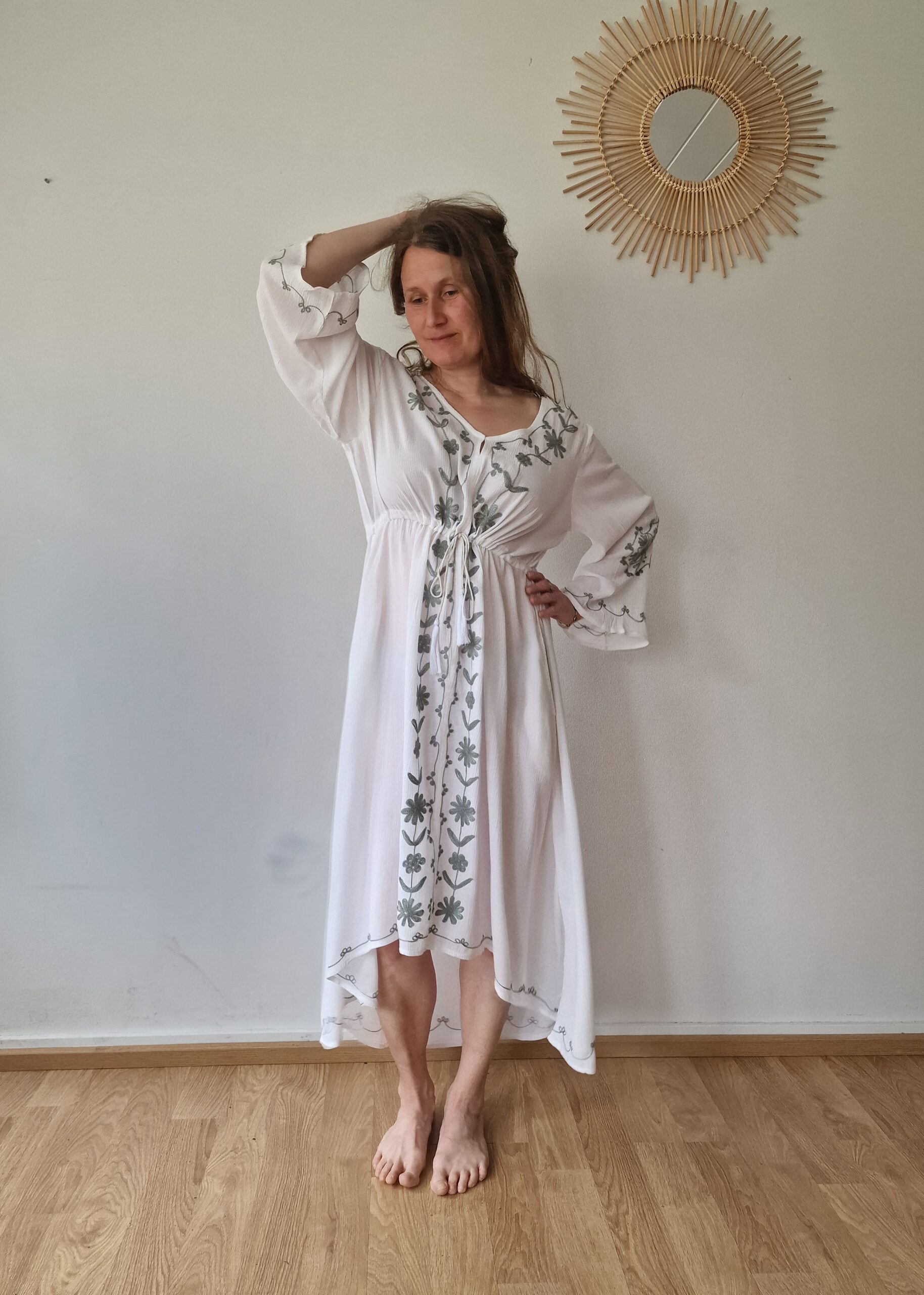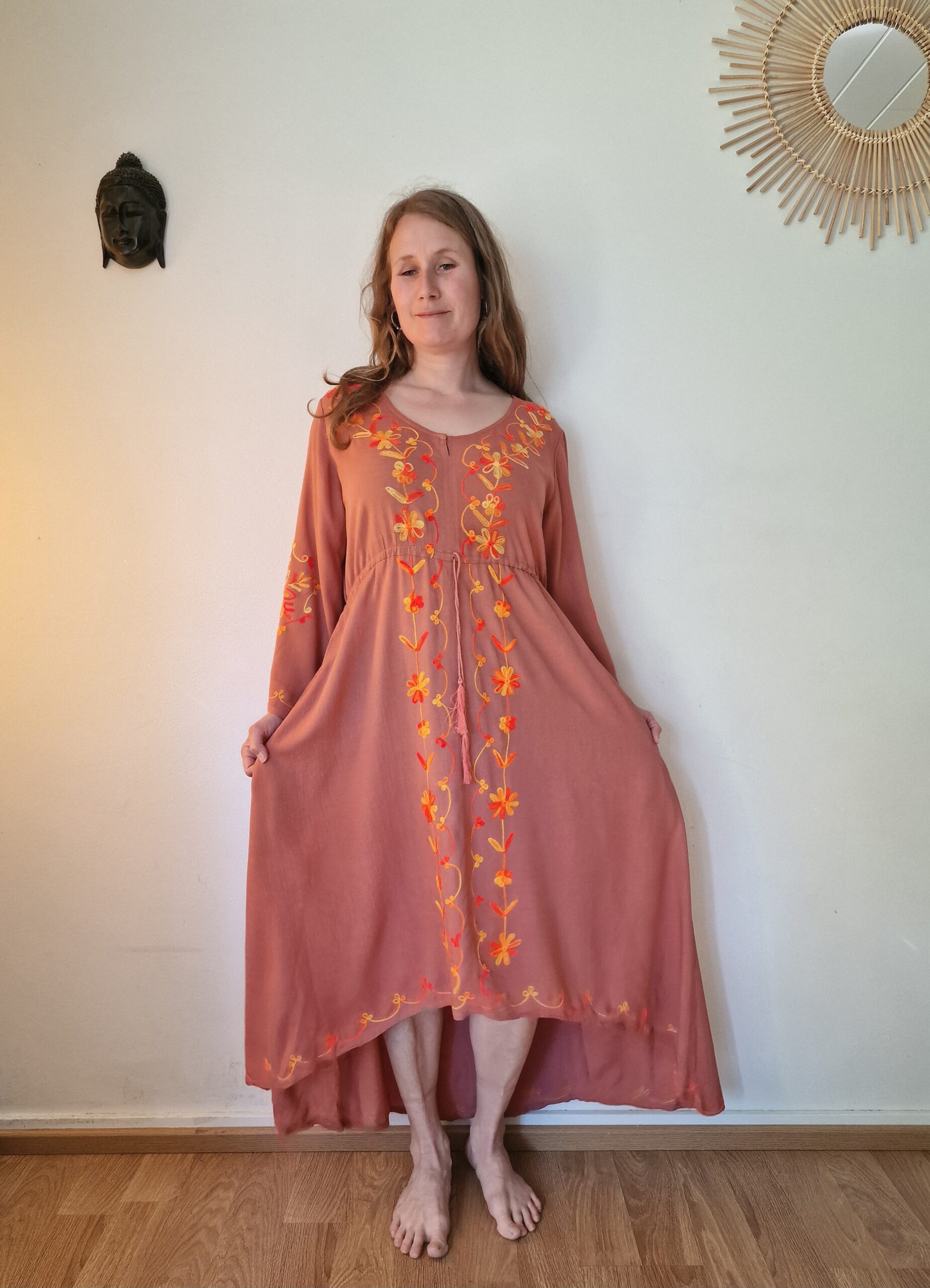 Kukkabrodeerauksilla koristeltu kaftaani.