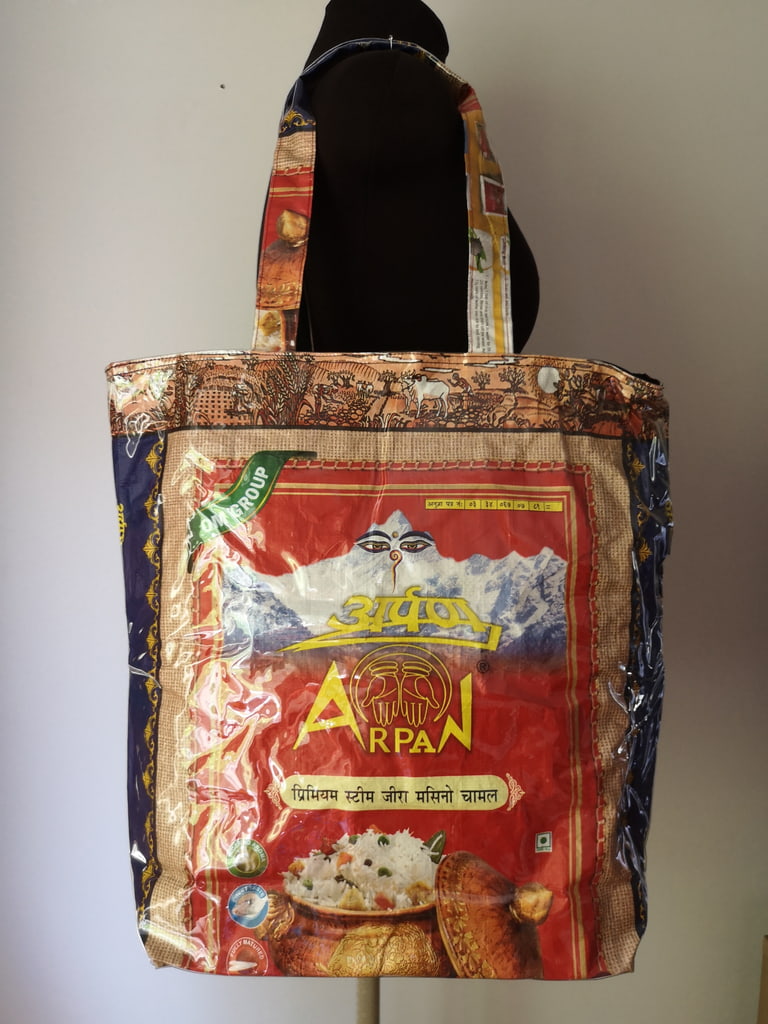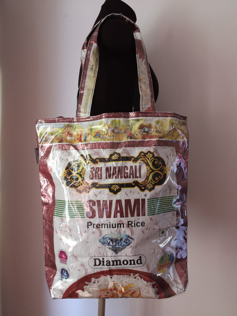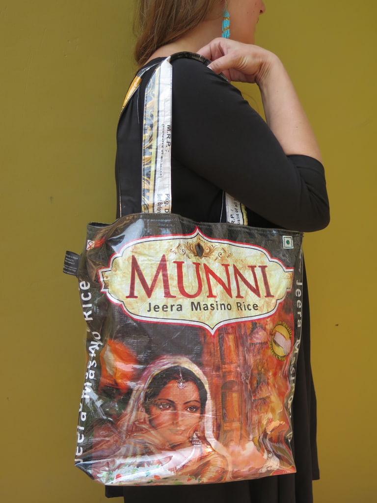 Kierrätetystä riisisäkistä valmistettu ostos- ja kaupunkilaukku on paitsi kestävä ja tilava, myös kannanotto kierrätyksen ja naisten voimaannuttamisen puolesta.