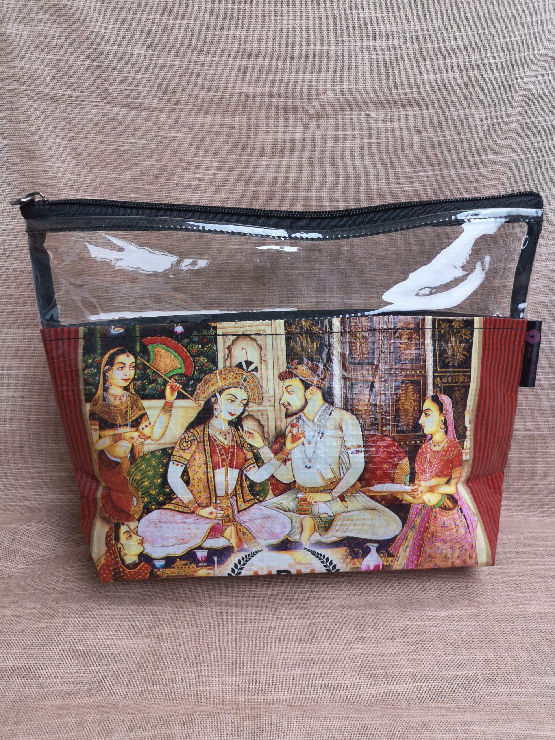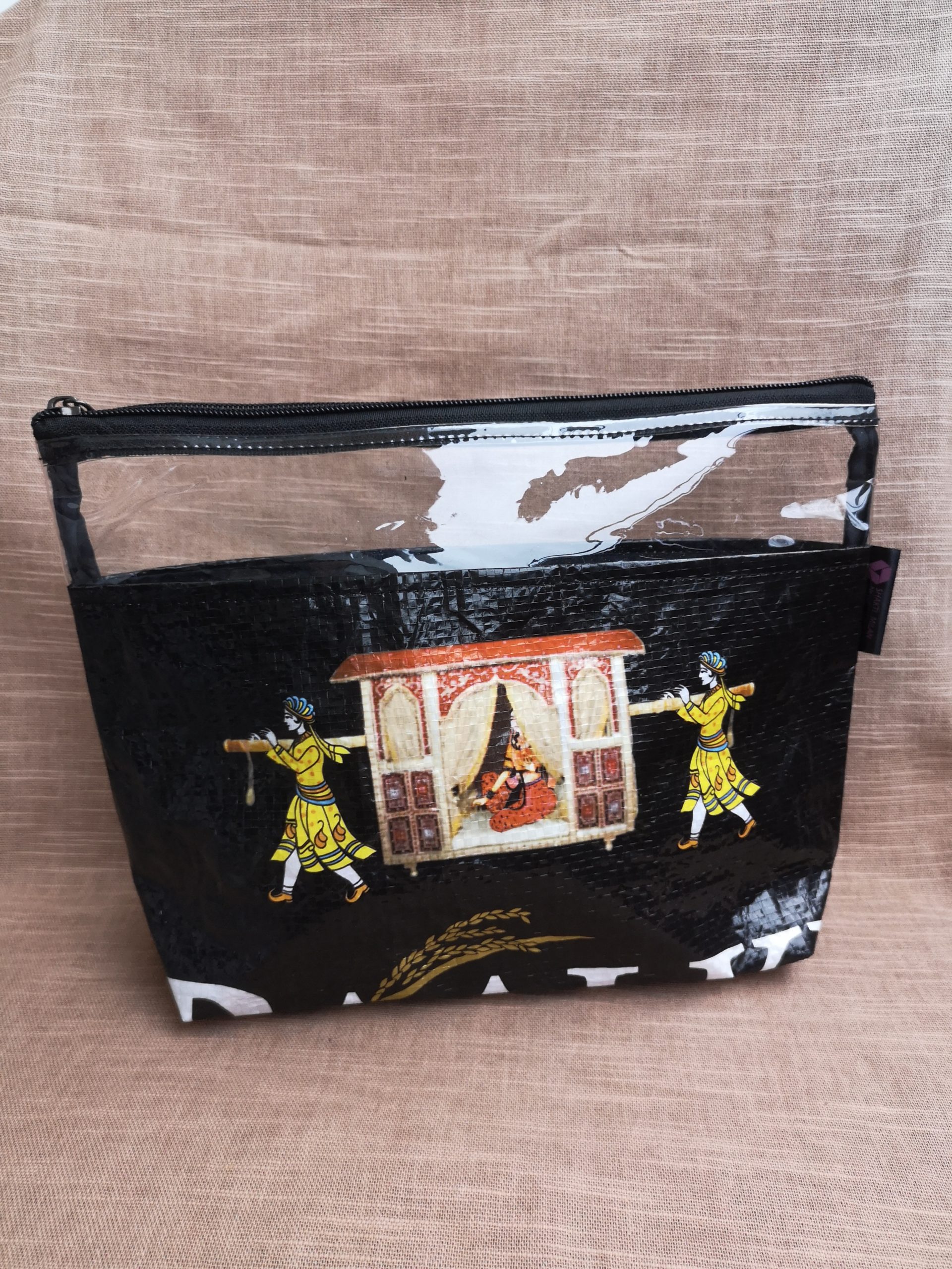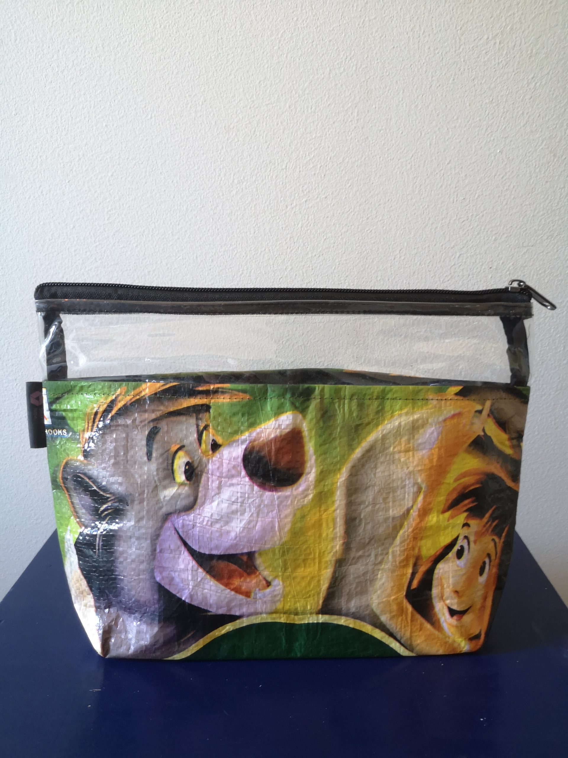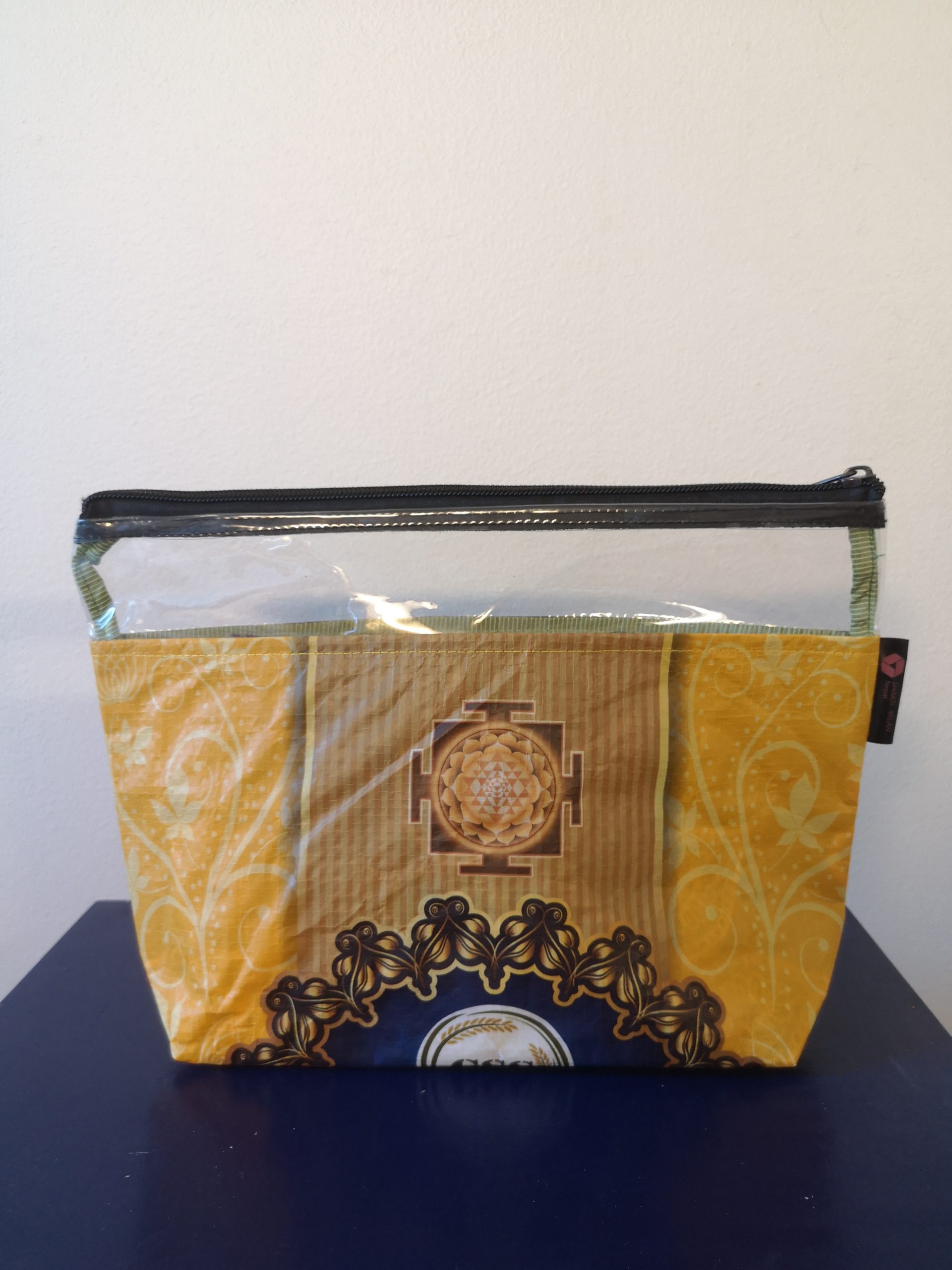 Tätä kierrätetystä riisisäkistä valmistettua pussukkaa voi käyttää moneen tarkoitukseen: meikkipussina, kosmetiikkalaukkuna, pikkutavaroille, kynille – you name it!