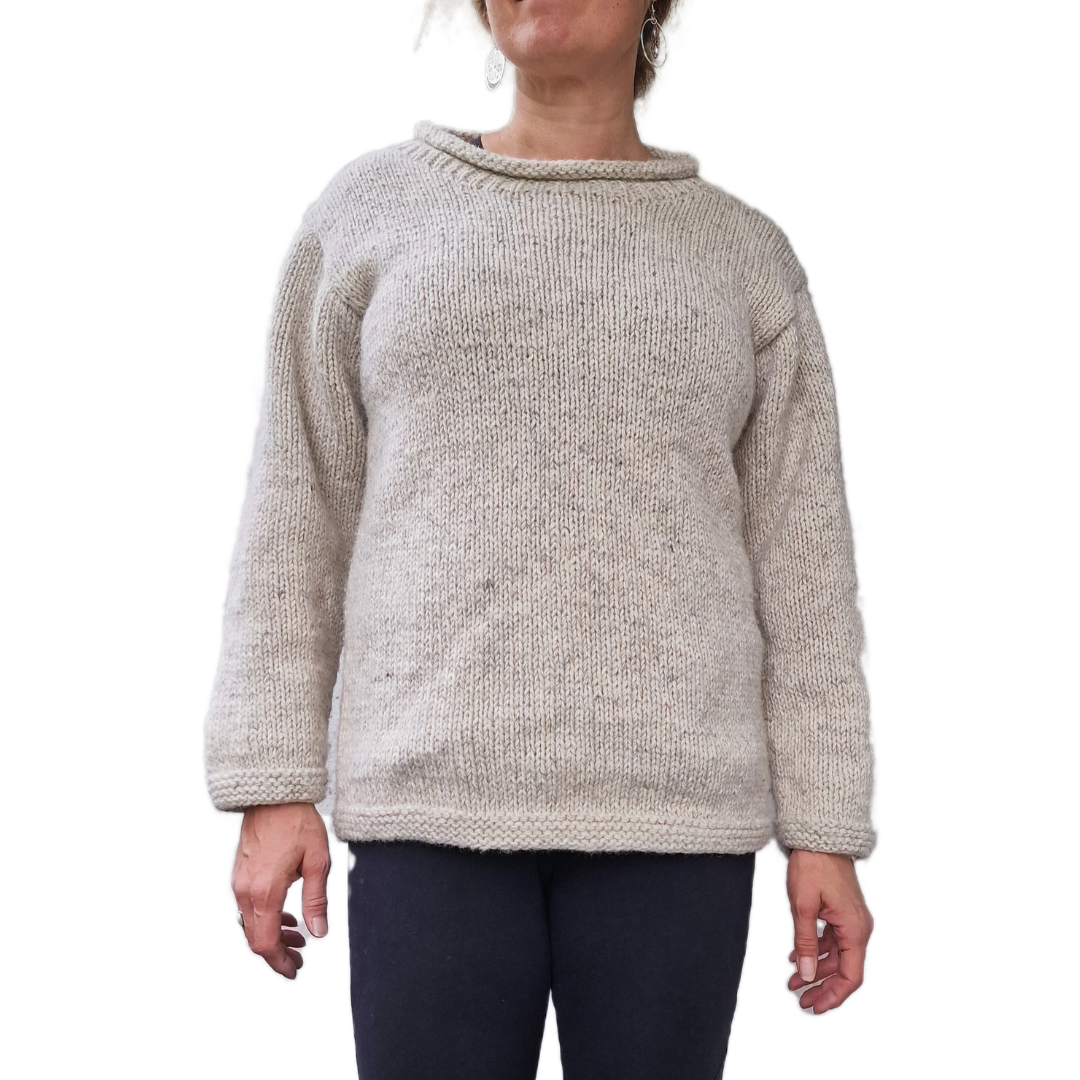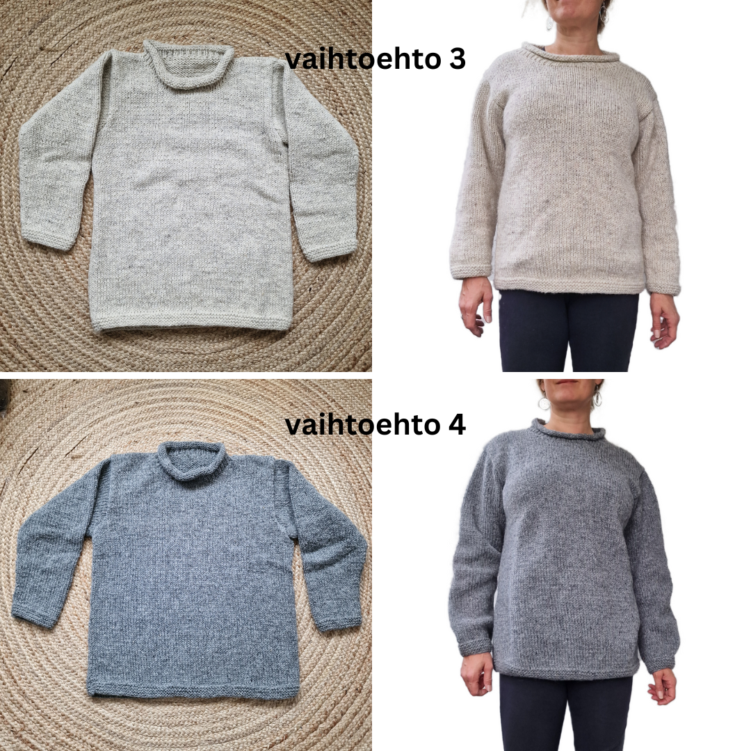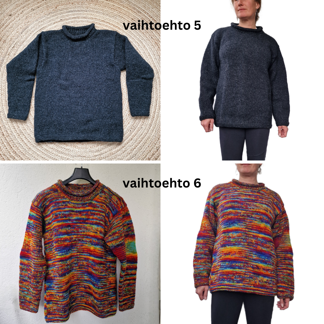 Paksusta ja rouheasta langasta käsityönä neulottu villapaita. Materiaali 100% lampaanvillaa. Valmistus työllistää haastavista oloista ponnistavia naisia Nepalissa.